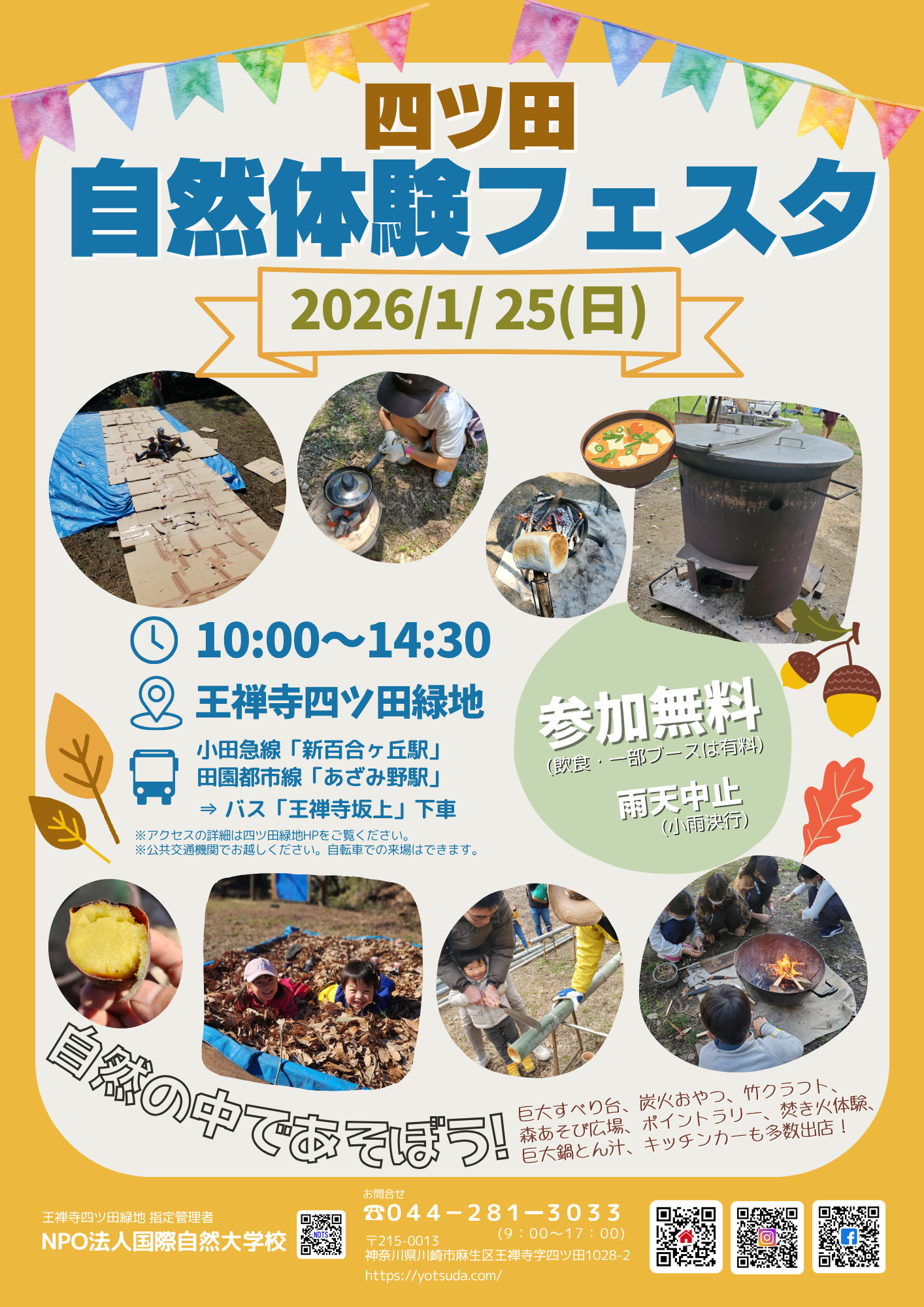 “自然を楽しむ”をテーマに、焚き火や自然物を使ったクラフトや遊び場、巨大鍋で作るとん汁などで遊べます。